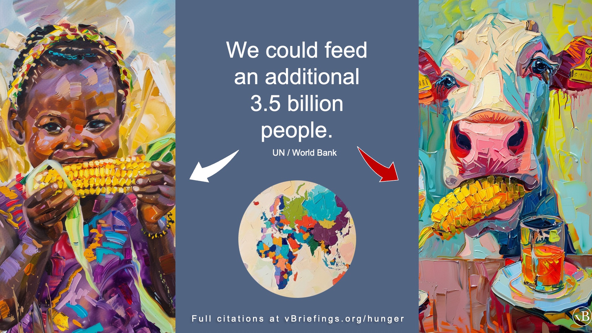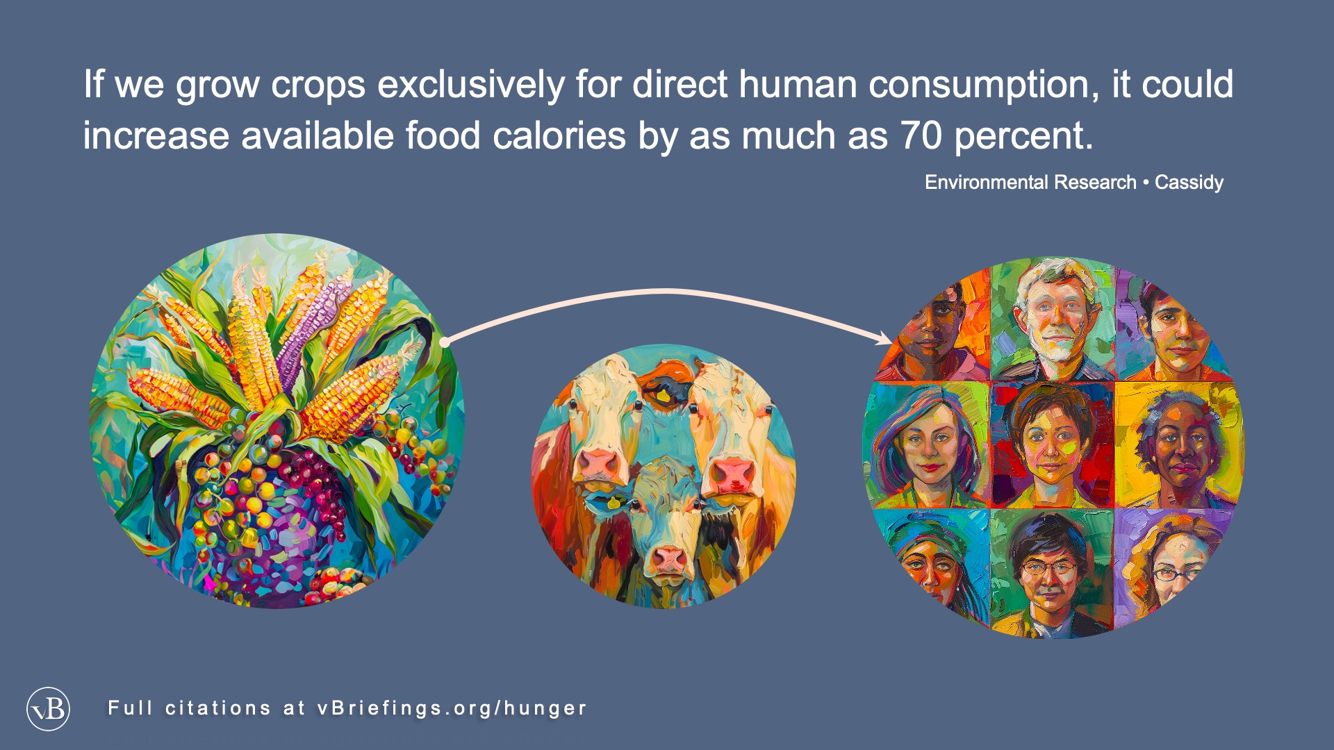 - “You’re right—hunger is about access, not just production. But why are we funneling food through animals first when that makes access even harder?”