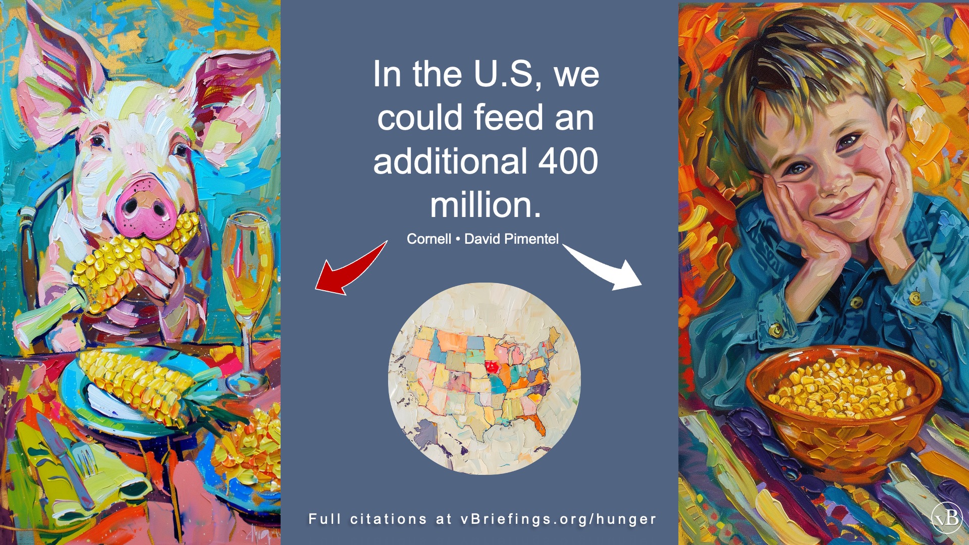 When discussing this topic, it’s likely the interlocutor will bring up the first counterclaim addressed on this page—that we already produce enough to feed everyone. So it would be a good idea to familiarize yourself with our suggested response.